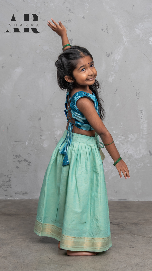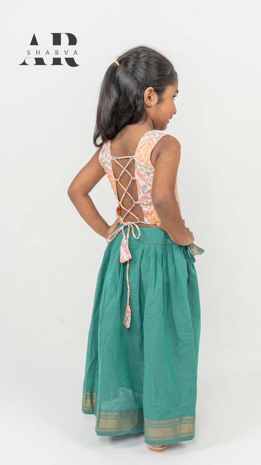 Peachy Ikat and Emerald Pavadai set