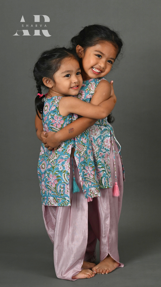 Turquoise Floral Kurta and Lilac Dhoti Pants Set