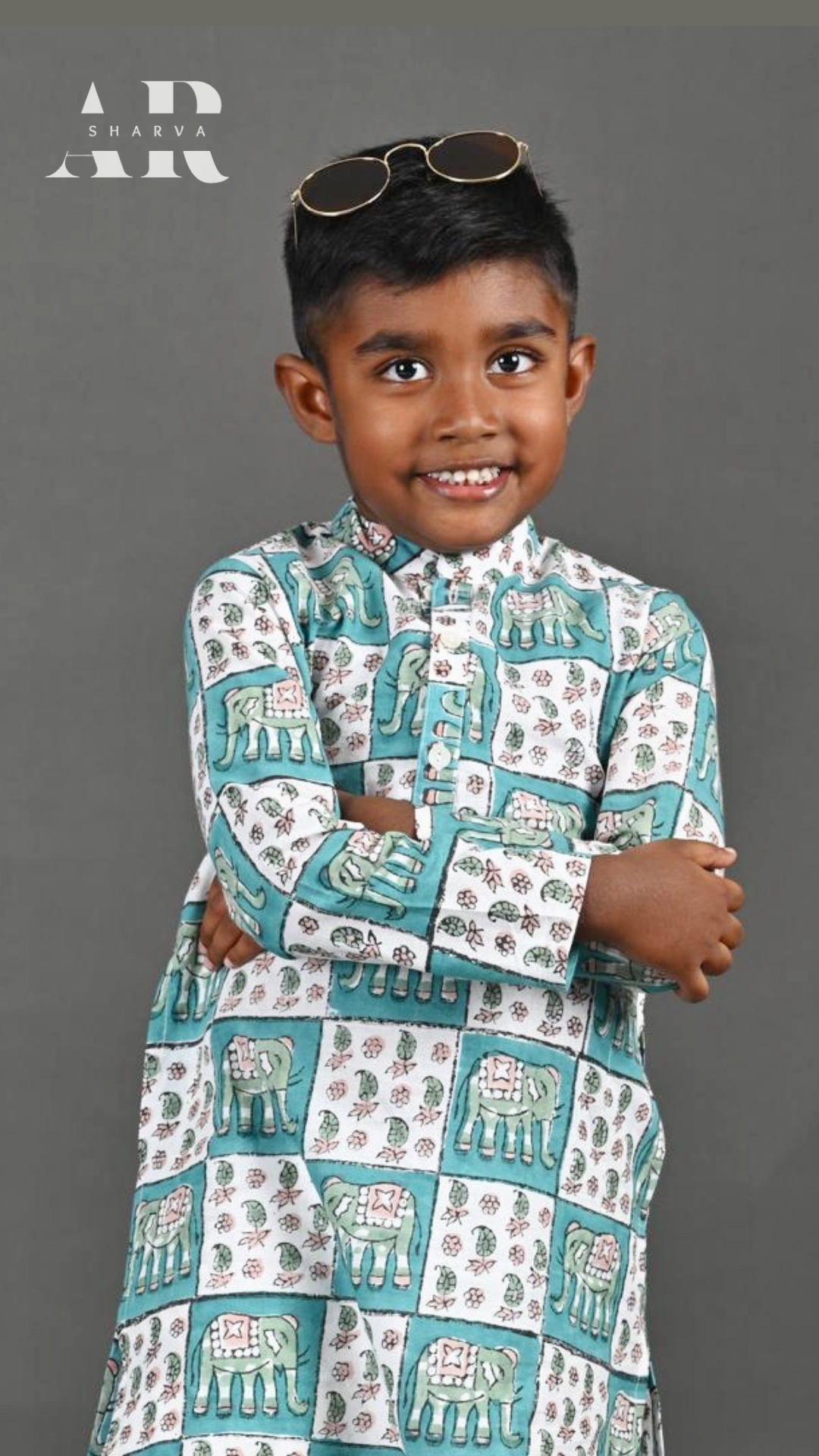 Let your little one march in style with this adorable teal kurta set, featuring playful elephant block prints in a checkered pattern. Made from soft cotton, it comes with comfy white pyjamas—perfect for festive fun or everyday charm.