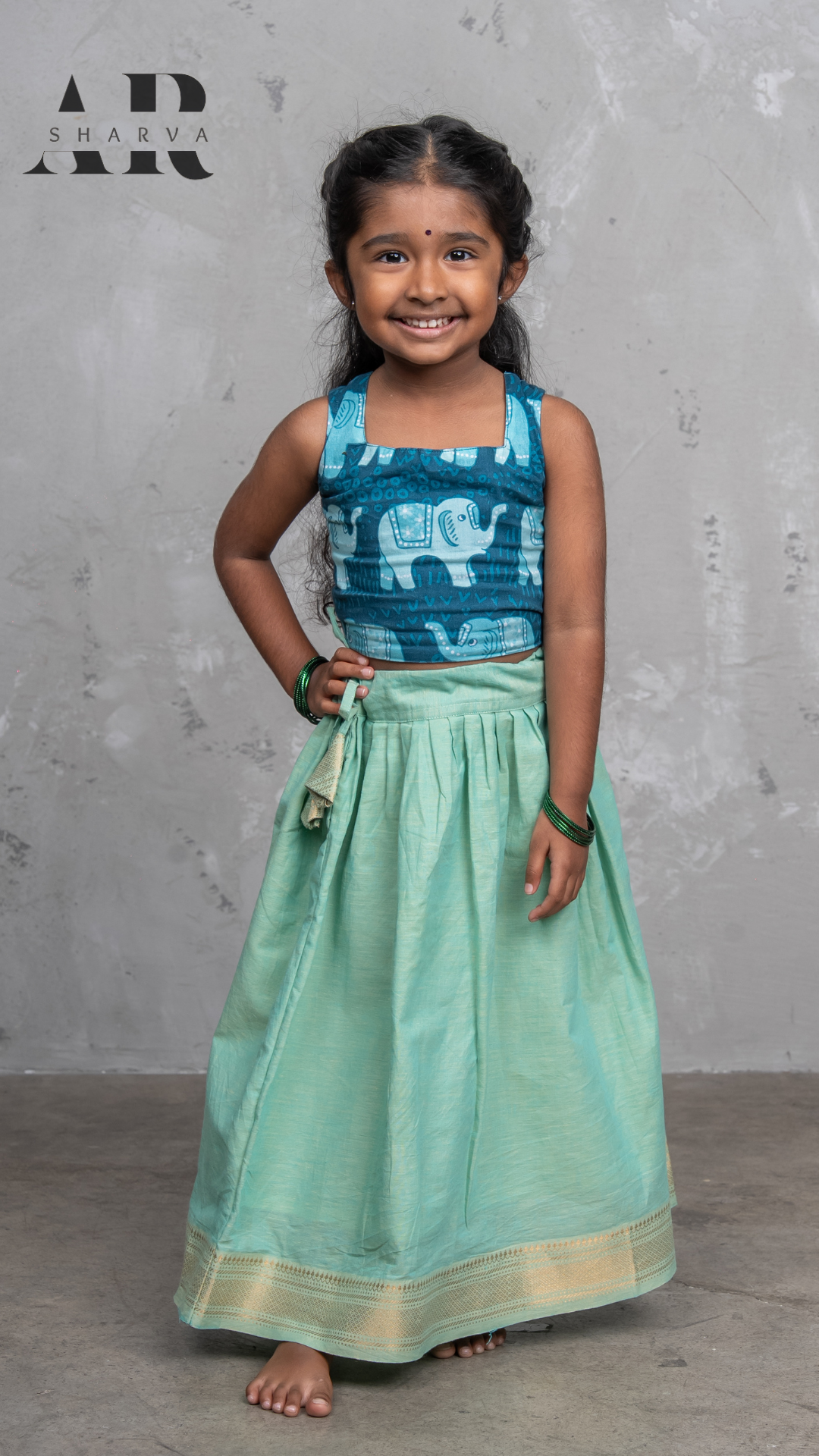 Tiny Tusker Tales ๐๐ซ A cheerful pavadai set in teal and mint, crafted in soft cotton โ perfect for little celebrations and sibling twinning!